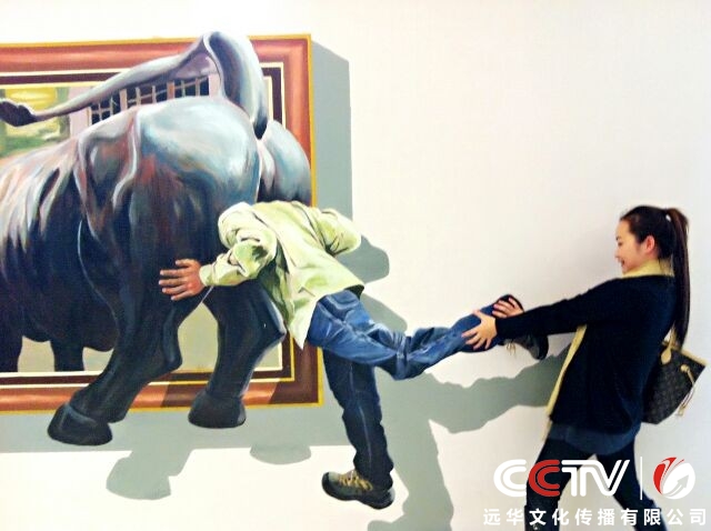 3D畫解析:是以地面或墻面為媒介,利用平面透視的原理,制造出視覺上的虛擬立體效果,令參觀者有一種身臨其境的感覺。3D畫在國內流行的時間并不長,但因其極具震撼力的視覺沖擊力,所到之處都引發(fā)參觀者的熱情“圍觀”。